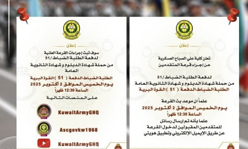 كلية علي الصباح العسكرية: اجراء القرعة العلنية لدفعة الطلبة الضباط ( 51 ) - القوة البرية من حملة الشهادة الدبلوم و شهادة الثانوية العامة يوم الخميس الموافق 2 أكتوبر 2025