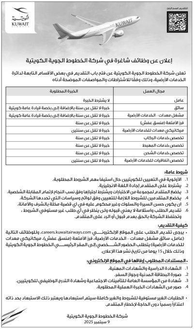 وظائف شاغرة في الخطوط الجوية الكويتية لجميع الجنسيات