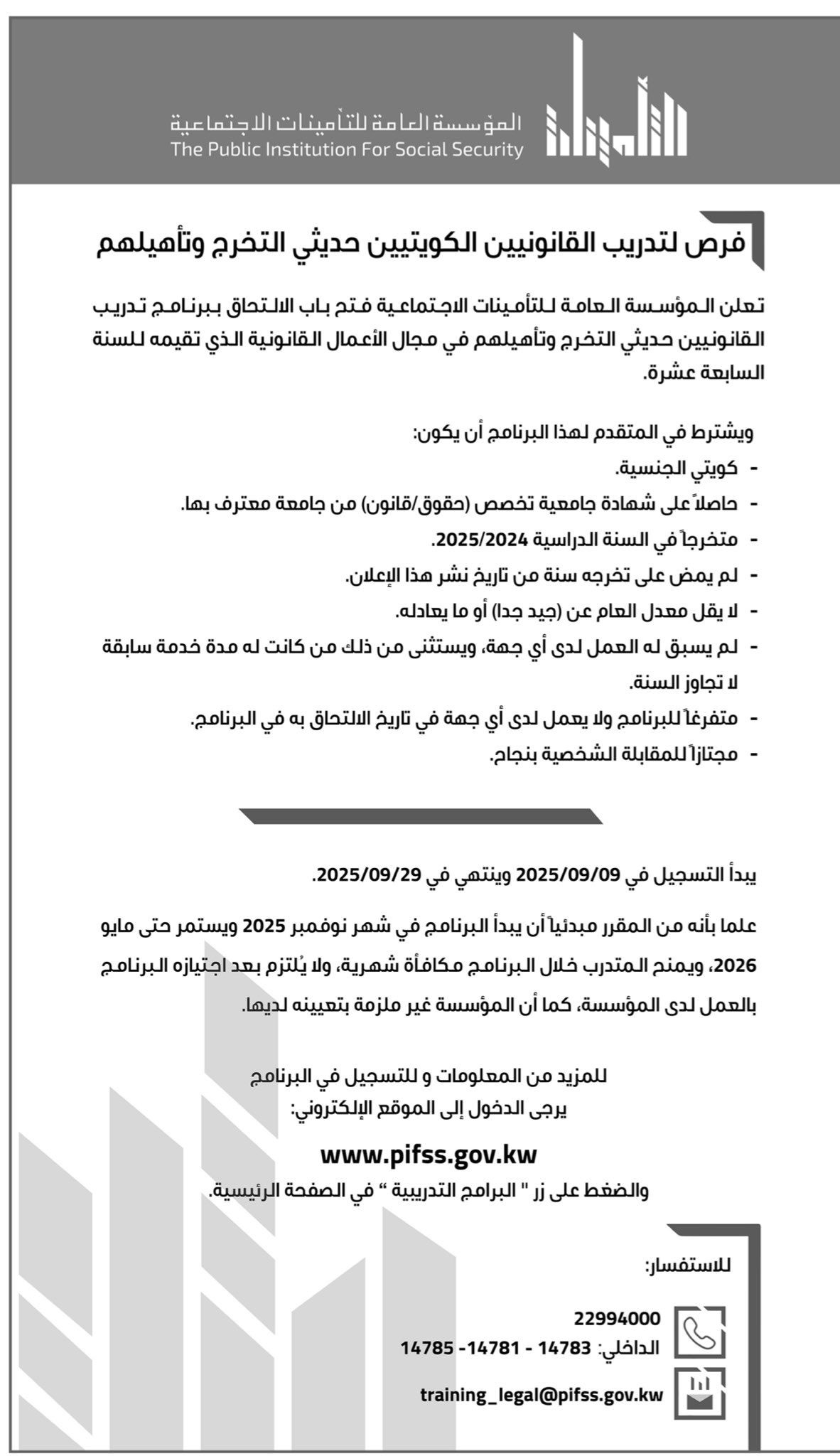 ![]() فرصة لتدريب القانونيين الكويتيين حديثي التخرج وتأهيلهم فرصة لتدريب القانونيين بالتأمينات ![]()