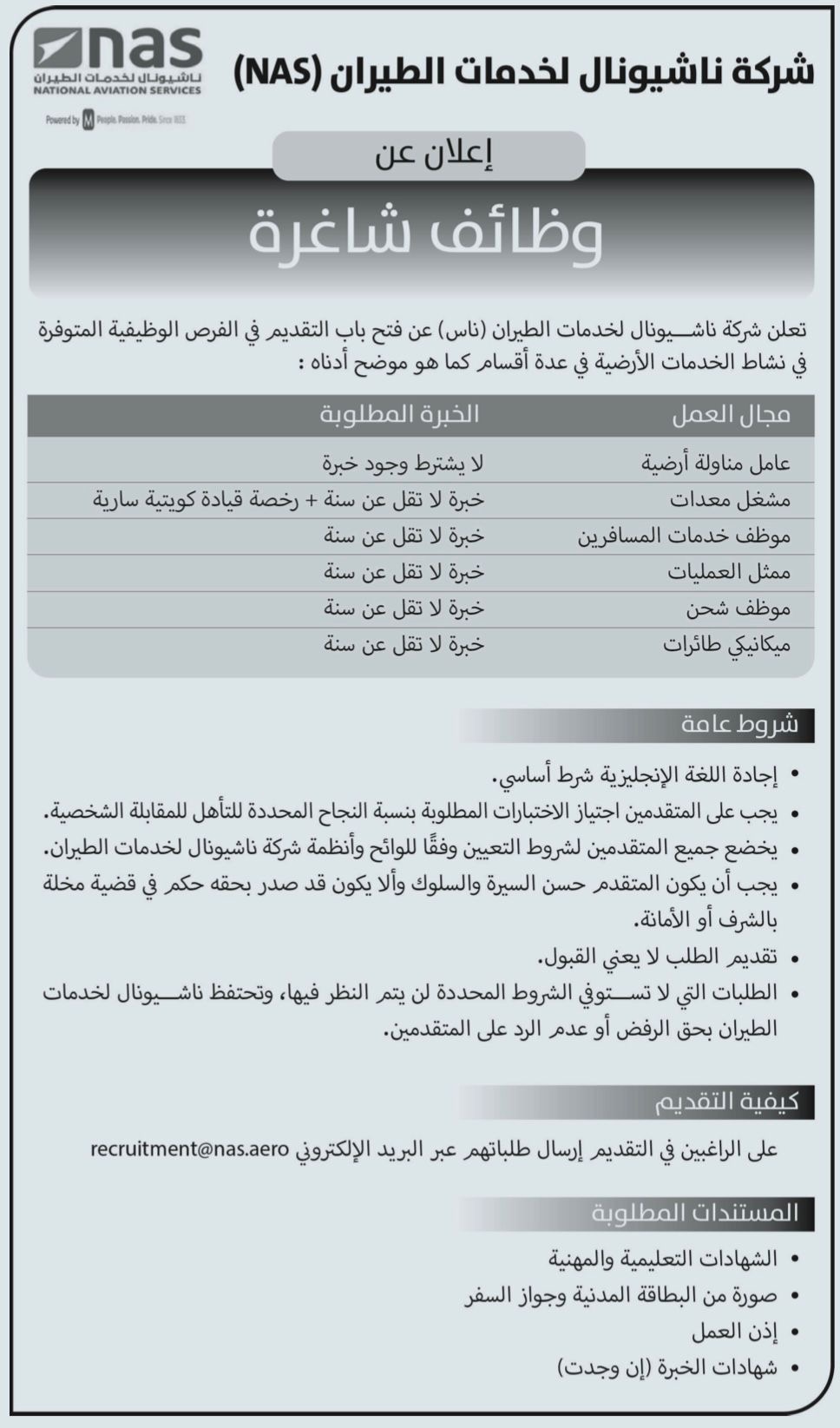 - وظائف شاغرة في شركة ناشيونال لخدمات الطيران (NAS)