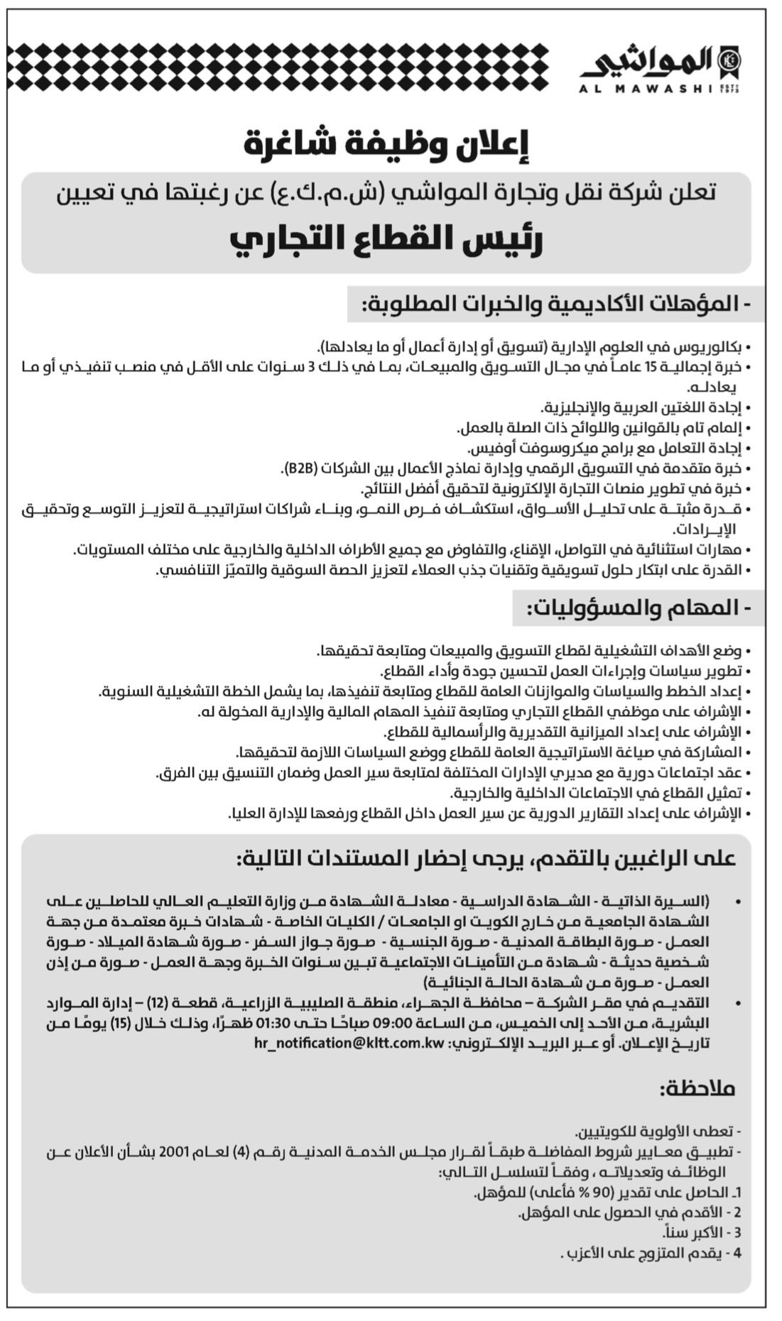 ![]() المواشي إعلان عن وظيفة شاغرة ![]() MAWASHI المواشي إعلان وظيفة شاغرة تعلن شركة نقل وتجارة المواشي (ش.م.ك.ع) عن رغبتها في تعيين