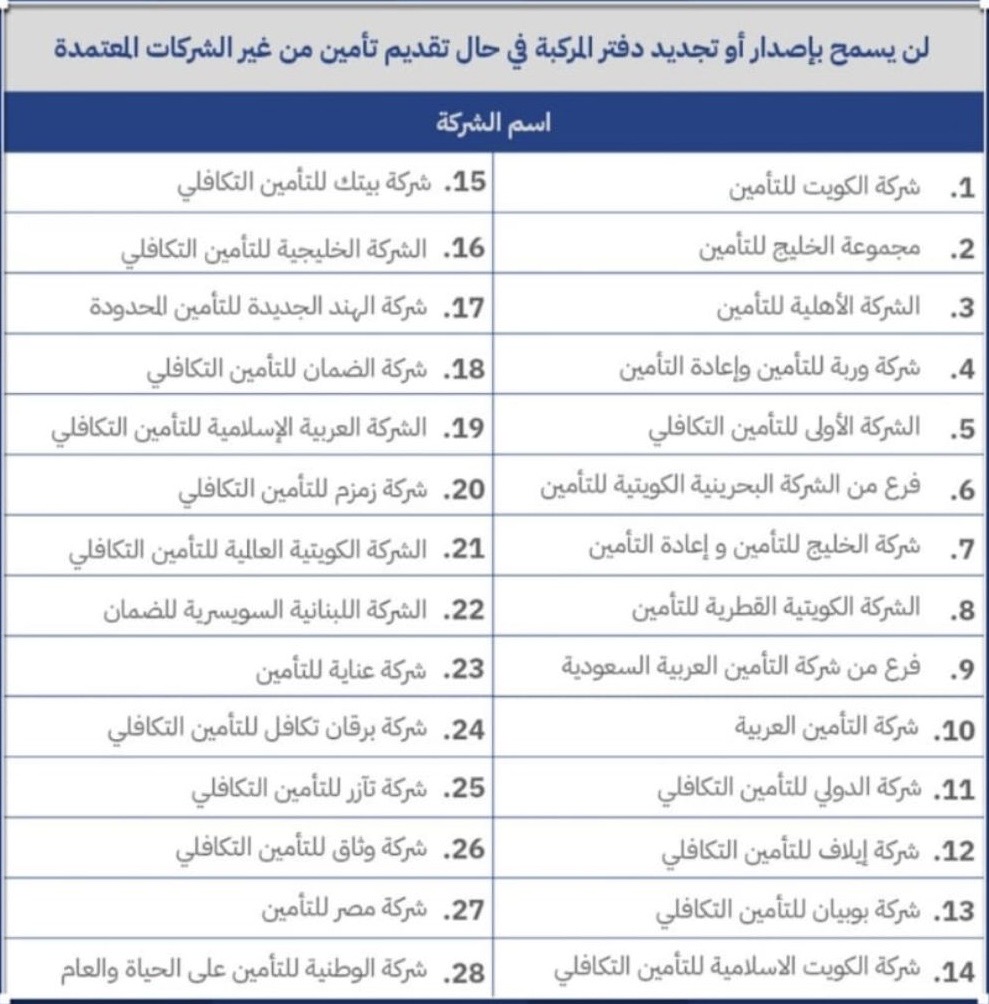 شركات التأمين المعتمده احرص علي احد هذه الشركات فقط تحديث القائمة المعتمدة للشركات المؤهلة لإصدار وثيقة التأمين من المسؤولية المدنية الناشئة عن حوادث المرور (التأمين الإجباري للمركبات) ![]() |