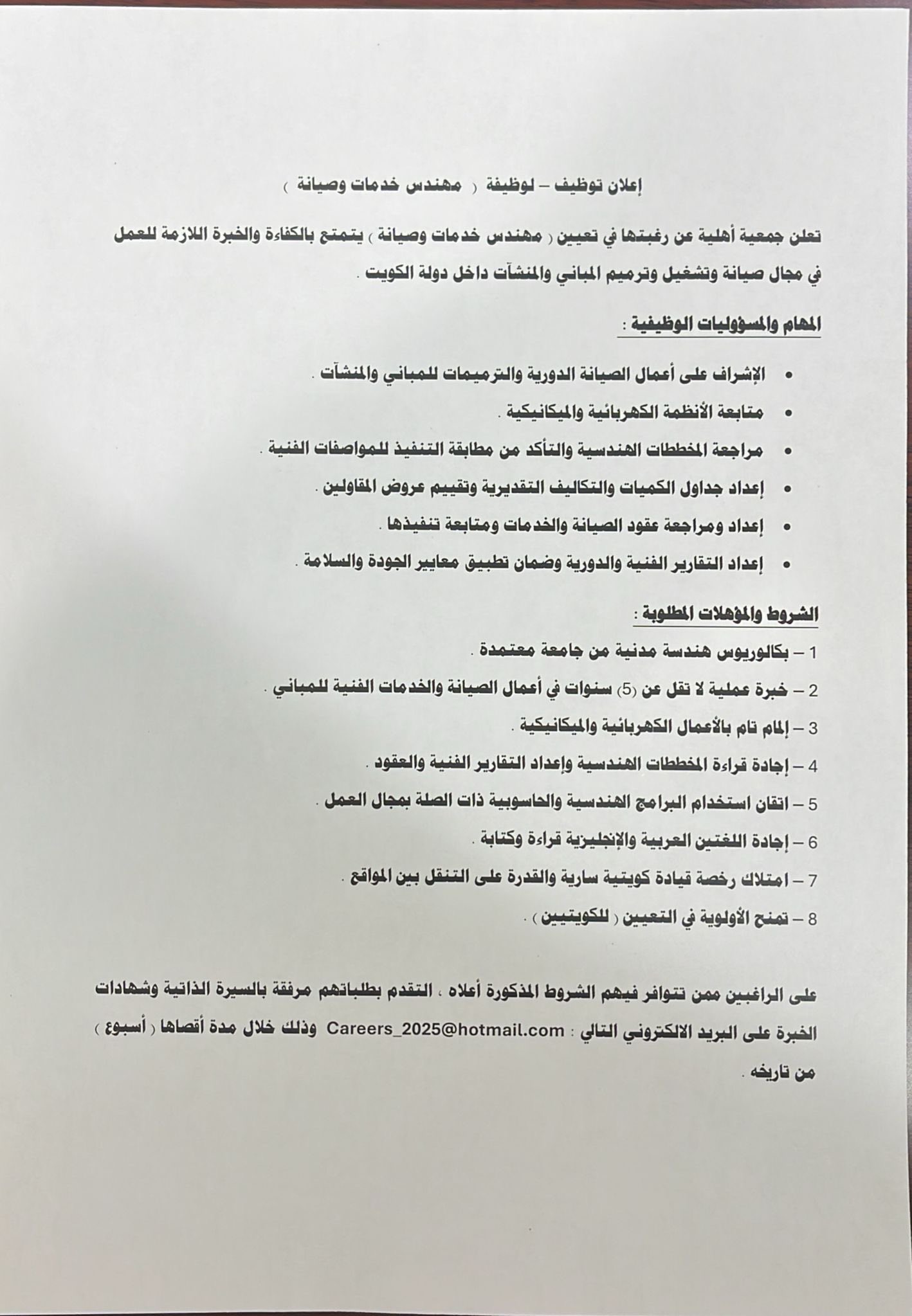 تعلن جمعية أهلية عن رغبتها في تعيين مهندس خدمات وصيانة يتمتع بالكفاءة والخبرة اللازمة للعمل في مجال صيانة وتشغيل المباني والمنشآت داخل الكويت