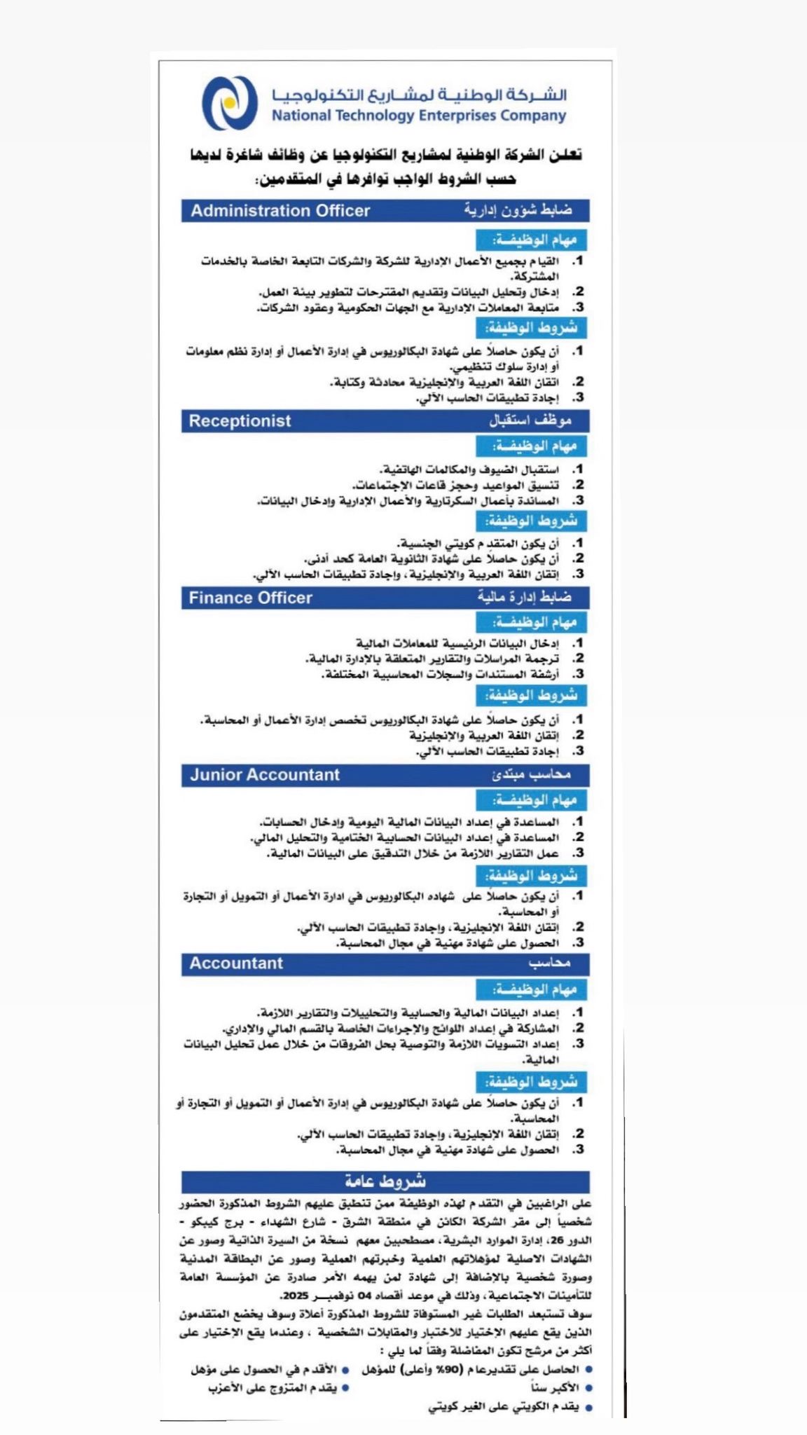وظائف شاغرة في الشركة الوطنية لمشاريع التكنولوجيا تعلن الشركة الوطنية لمشاريع التكنولوجيا عن وظائف شاغرة لديها حسب الشروط الواجب توافرها في المتقدمين: ![]()