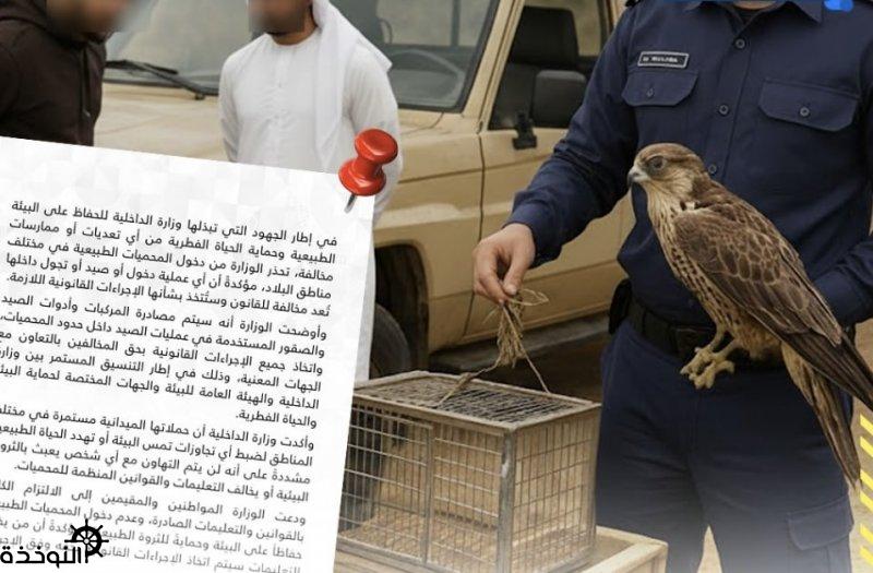 وزارة الداخلية اتخاذ الإجراءات ضد من يمارس الصيد داخل المحميات الطبيعية ومصادرة مركبات وأدوات وصقور الصيد المخالف
