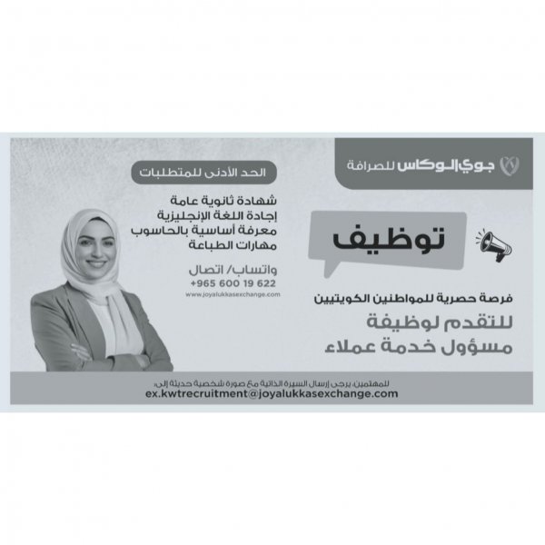 فرضة وظيفية لاصحاب الثانوية عامة فرصة حصرية للمواطنين الكويتيين للتقدم لوظيفة مسؤول خدمة عملاء واتساب/ اتصال 60019622