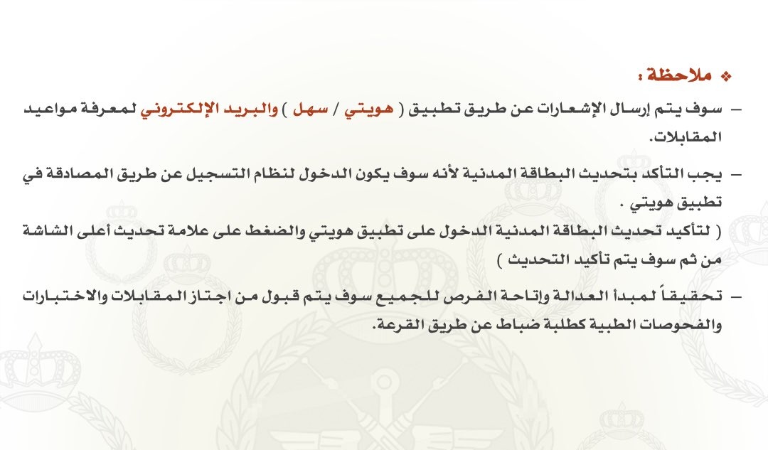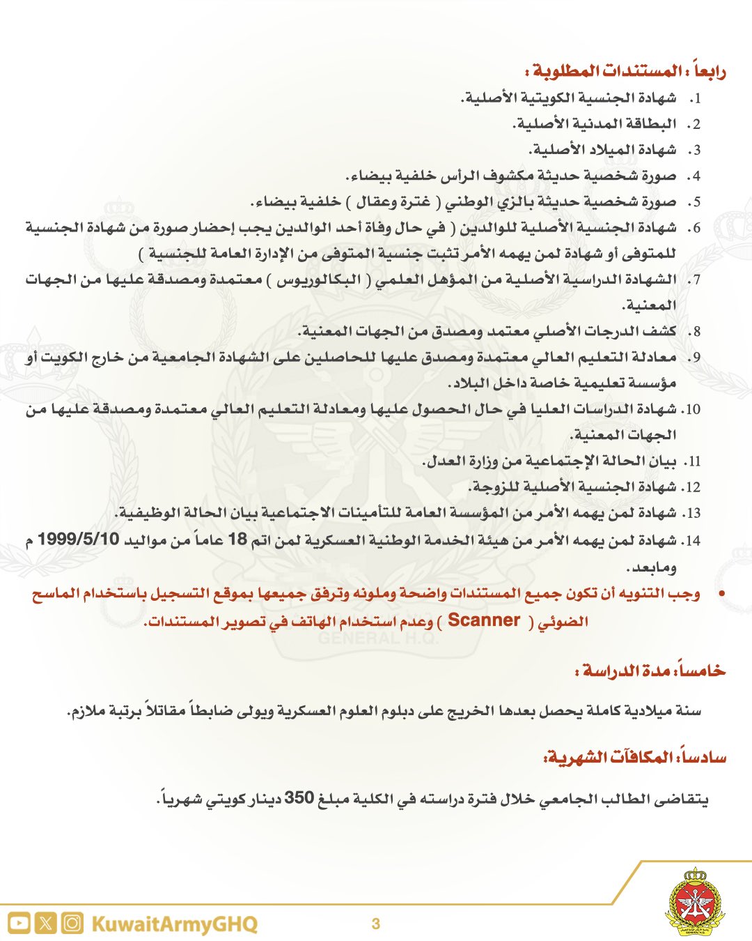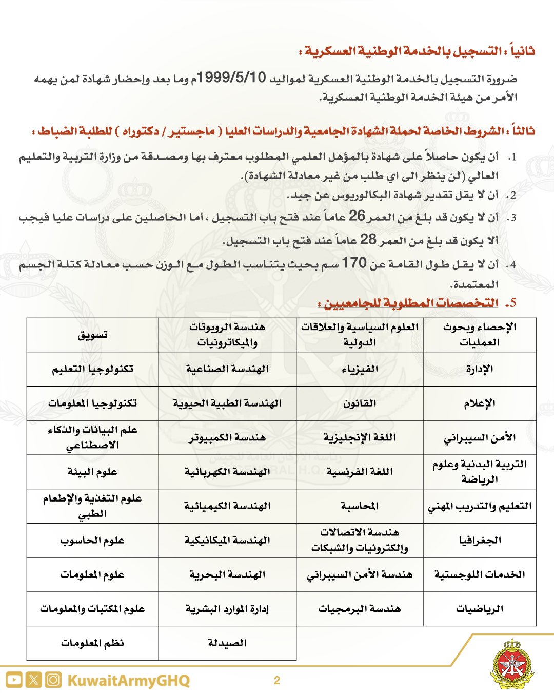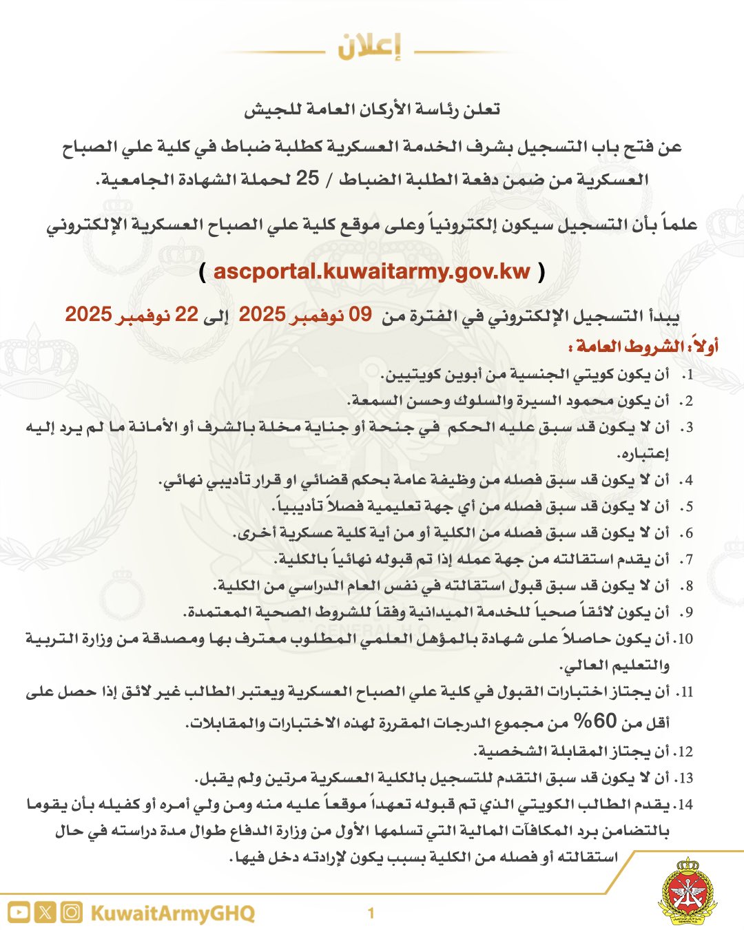 الجيش الكويتي: فتح التسجيل ضباط أختصاص لحملة الشهادة الجامعية تعلن رئاسة الأركان العامة للجيش عن فتح باب التسجيل للالتحاق بشرف الخدمة العسكرية كطلبة ضباط في كلية علي الصباح العسكرية، ضمن دفعة الطلبة الضباط (25) لحملة الشهادة الجامعية. في الفترة من 9 نوفمبر 2025 إلى 22 نوفمبر 2025. ![]() ![]() ![]() ![]()