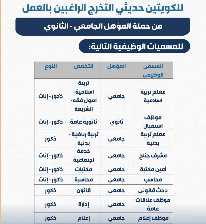 يوم وظيفي – جمعية النجاة الخيرية بدعوة من الهيئة العامة للقوى العاملة، تعلن جمعية النجاة الخيرية عن إقامة يوم وظيفي للكويتيين حديثي التخرج والراغبين بالعمل، لحملة المؤهل الجامعي والثانوي، بعدة مسميات وظيفية وتخصصات مختلفة.