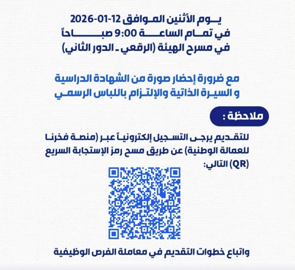 📝 التسجيل إلكترونيًا عبر منصة “فخرنا للعمالة الوطنية” من خلال رمز QR الموضح بالإعلان.