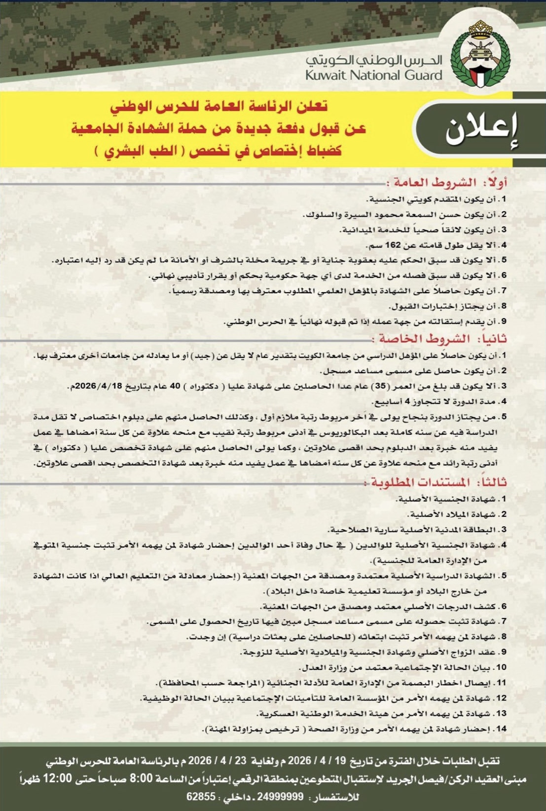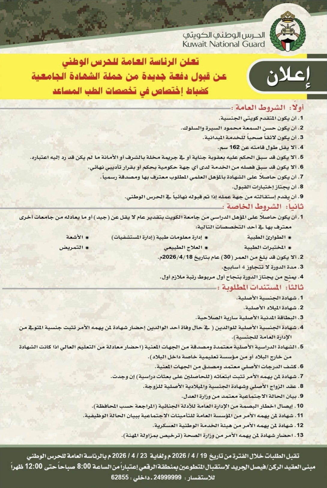 الحرس الوطني .. فتح باب التقديم لضباط الاختصاص - الطب البشري والتقديم بالرئاسة العامة للحرس الوطني مبنى العقيد الركن/فيصل الجريد لإستقبال المتطوعين بمنطقة الرقعي إعتباراً من الساعة 8:00 صباحاً حتى 12:00 ظهراً ![]() ![]()